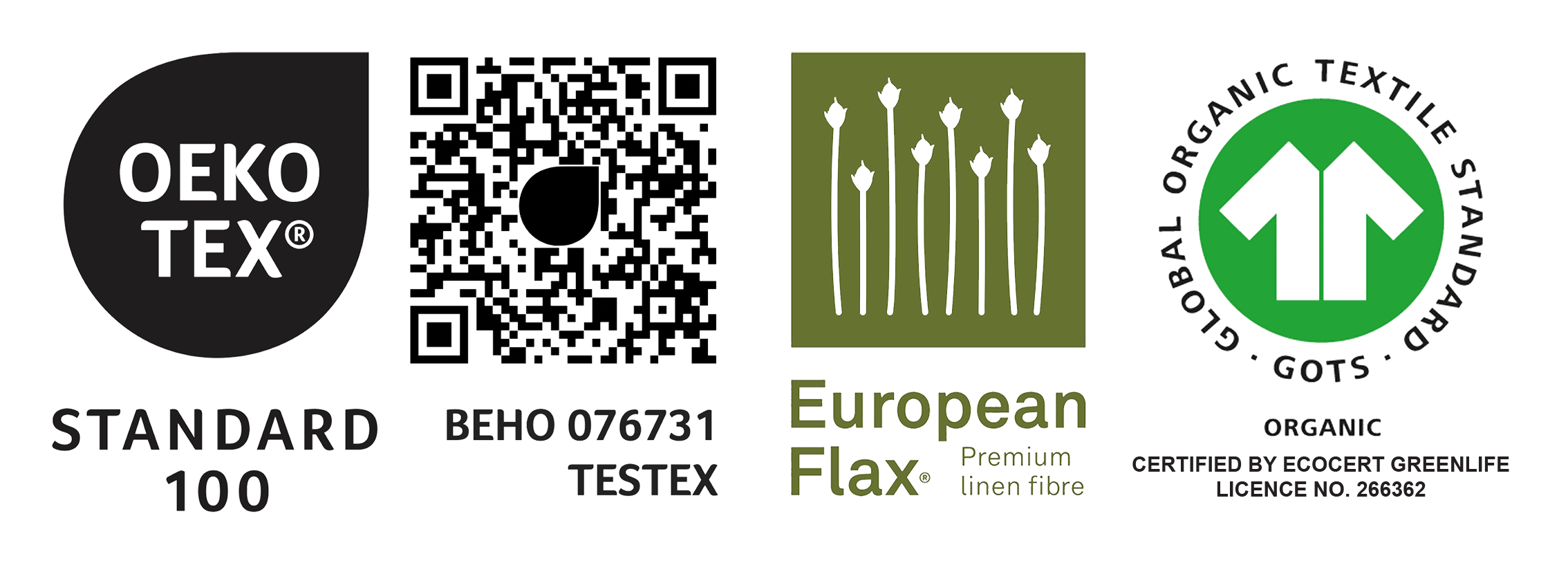 • European Flax™, lo que garantiza que el lino proviene de Europa, específicamente de regiones donde la producción de lino se realiza siguiendo prácticas agrícolas responsables y sostenibles, minimizando el uso de químicos y promoviendo técnicas respetuosas con el medio ambiente.